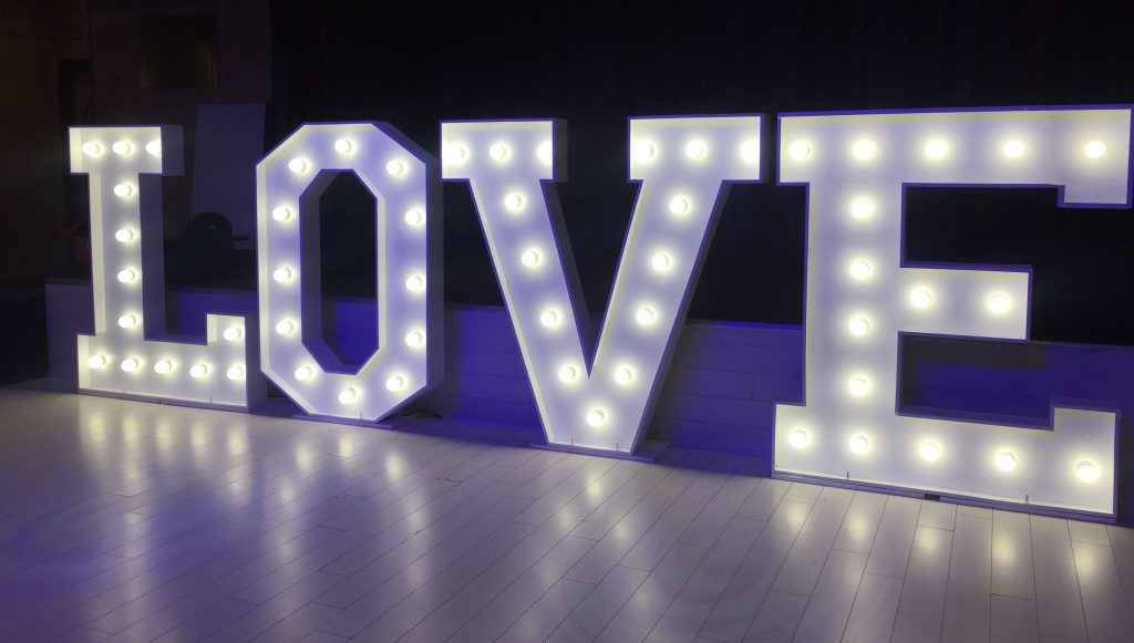 Letras decorativas para vuestra boda o evento. Realizadas en madera de 1,20 m cada, una y con decoración de 70 bombillas de luz cálida para darle un ambiente acogedor a vuestro evento.